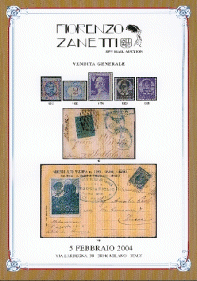 ZANETTI FIORENZO via Sardegna 30, 20146 Milano MI tel. 02. 4984929, fax 02. 48194399 www.postalhistory.it, e-mail fiorenzo.zanetti@fastwebnet.it 53^ Asta per corrispondenza. Vendita generale. Scadenza 5 febbraio 2004 Vendita generale di 1.381 lotti presentati nella consueta ricca veste con anche numerose illustrazioni a colori. In copertina diversi francobolli rari come il lotto 1213, base € 2.000, il 2 su 5 lire Pechino, o il lotto 1185, base € 450, un segnatasse del 1870 da 2 lire con cifra capovolta, o il lotto 1174, base € 1.200, il cosidetto "Volta violetto"e il lotto 756, base € 3.000, una cartolina della Funicolare Aereostatica Alta Matanna spedita da Palagna il 5 ottobre 1910: una delle tre note spedite nelle prove di collaudo. Quest’asta è molto varia. Vi sono un centinaio di lotti di Antichi Stati Italiani, poi la parte classica del Regno con un altro centinaio di lotti. Notevole la rappresentanza della R:S.I., Luogotenenza e Repubblica (con servizi ed interi postali). Ricca la presentazione degli Uffici Italiani all’Estero, delle Colonie e delle Occupazioni italiane e straniere. Qui si distiguono gli annullamenti di Galla e Sidama, Harar e Scioa. Molti i lotti di Posta Militare, specialmente della 1° e della 2° Guerra Mondiale. Numerosi e particolarmente interessanti quelli di Europa ed Oltremare, relativi alla Posta Aerea italiana e straniera, ai voli Zeppelin, ai Ballons Montées, alla Navigazione ed alla Sanità. Chiudono la vendita le proposte di lotti e collezioni, le belle offerte di autografi, specialmente dei Savoia e di musicisti famosi |