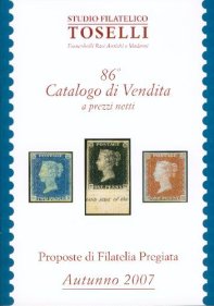 TOSELLI via Matteotti 143, 18038 San Remo IM tel. 0184.531528, fax 0184.570366 www.toselli.com, e-mail toselli@toselli.com 86° Catalogo di Vendita a prezzi netti, Autunno 2007 Elegante catalogo, in carta patinata, tutto a colori, comprendente solo 168 lotti ma veramente scelti. Si tratta di francobolli, in massima parte nuovi, di qualche Ballon Montée e diversi documenti di Posta Aerea ed Aerogrammi. E’ una sfilata di francobolli di qualità e, come al solito per Toselli, si tratta di "Proposte di Filatelia Pregiata".