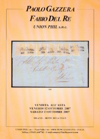 UNION PHIL SNC Paolo Gazzera e Fabio Del Re Piazza Failla 3ter, 10024 Moncalieri TO tel. e fax 011.6407760 www.filateliagazzera.com, e-mail contact@filateliagazzera.com Vendita all’asta, 12 e 13 ottobre 2007 a Milano Gazzera e Del Re ci presentano un altro elegante ed imponente catalogo in formato A4 interamente a colori comprendente esattamente 3.500 lotti. In copertina il lotto 243, base € 9.800, una bella lettera del 1851 da Piadena affrancata con una striscia di cinque ed un singolo del 5c giallo di Lombardo Veneto. Al retro di copertina, rari francobolli e qualche bella lettera, come il lotto 504, base € 4.500, un frontespizio affrancato con un 50 grana isolato da Napoli per Madrid, o i lotti 282 e 289, due tricolori di Lombardo Veneto, o il lotto 729, base € 4.500, una lettera partita da Ancona l’11 settembre 1860, il primo giorno del Governo Provvisorio delle Marche, o il lotto 1184, base € 2.500, una circolare del 1857 da Livorno a Modena affrancata con una striscia di tre del 1 quattrino nero. Le proposte coprono tutti i settori dell’area italiana, con buone offerte anche di vari Paesi Europei e d’Oltremare. Fra gli Antichi Stati, cioè Lombardo Veneto, Napoli e province Napoletane, Parma, Pontificio, Romagne, Regno di Sardegna, Sicilia e Toscana, si distinguono in particolare il Lombardo Veneto, il Pontificio e la Sardegna. Molti sono anche i lotti del Regno d’Italia, anche del 1900. Si prosegue poi con la Repubblica Sociale Italiana, le Occupazioni, la Luogotenenza e la Repubblica per arrivare quasi ai nostri giorni. Da non trascurare Vaticano e San Marino e tutta l’area delle Colonie e dei Possedimenti italiani. Ciò che caratterizza questa asta è la dispersione della collezione "Michetti" di Mauro Francaviglia, la più importante del settore. Si tratta di un insieme difficilmente ripetibile, montato su ben 600 fogli espositivi, dal quale i numerosi appassionati potranno attingere buon materiale spesso unico da inserire nelle loro raccolte. Altra notevole collezione dispersa è quella di India ed Uffici all’estero. Diversi i lotti di Paesi Europei, come Francia, Germania, Gran Bretagna e specialmente Svizzera. Notevole il settore “Lotti e collezioni” e Letteratura, complessivamente con oltre 300 proposte. |
