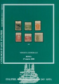 Vendita all'asta del 1 marzo 2008 a Milano Paolo Gazzera e Fabio Del Re ci presentano 2.246 lotti in un elegante ed importante catalogo in formato A4 interamente a colori. In copertina il lotto 2176, base € 3.800, una rara circolare doppio porto del 1856 da Pest, in Ungheria, a Torino, Regno di Sardegna. Al retro di copertina, accanto a vari francobolli di Antichi Stati Italiani e G.N.R., un “Volo di Ritorno New York-Roma, qualche bella lettera, come il lotto 524, base € 4.000, una lettera del 1856 con un blocco di sette più uno del ½ baj di Pontificio che fa coppia col lotto 522, base € 3.500, un’altra lettera con un blocco di otto dello stesso francobollo. Vi è anche il lotto 293, base € 5.000, una lettera con un 45c di Lombardo Veneto da Padova per la Transilvania. Le proposte coprono tutti i settori dell’area italiana, con buone offerte anche di vari Paesi Europei e d’Oltremare. Fra gli Antichi Stati, cioè Lombardo Veneto, Napoli e province Napoletane, Parma, Pontificio, Romagne, Regno di Sardegna, Sicilia e Toscana, si distingue in particolare la Sardegna dove prosegue la dispersione di una importante collezione di annullamenti, questa volta con la provincia di Cuneo. Molti sono anche i lotti del Regno d’Italia, anche del 1900. Si prosegue poi con la Repubblica Sociale Italiana, le Occupazioni, la Luogotenenza e la Repubblica per arrivare quasi ai nostri giorni. Da non trascurare Vaticano e San Marino e tutta l’area delle Colonie e dei Possedimenti italiani. Sono proposti anche due lotti a trattativa privata. Si tratta di una lettera del 1857 da Codogno con due francobolli da 15c di Lombardo Veneto annullati in arrivo con la griglia di Parma e di una assicurata da Napoli per Parigi del 1860 con una eccezionale affrancatura di 140 grana comprendente anche una coppia del 50 grana. Viene anche dato il calendario delle prossime aste del 2008, che si terranno il 14 giugno, il 27 settembre ed il 13 dicembre. |