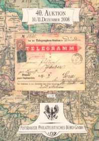 POTSDAMER Apfelweg 12, D-14469 Potsdam (Germania) www.potsdamer-phila-buero.de, e-mail auktion@potsdamer-phila-buero.de 40^ Asta del 10 e 11 dicembre 2008 Karlfried Krauss e Michael Jasch ci presentano questo nuovo catalogo, in carta patinata, tutto a colori, molto elegante e curato, comprendente 2.558 lotti. In copertina, sullo sfondo di una carta postale tedesca, figura il lotto 399, base € 7.000, una busta per Telegramma spedita raccomandata nel 1860 affrancata con francobolli di Sassonia. Il catalogo comprende lettere e francobolli soprattutto dell’area tedesca, ma può interessare il collezionista italiano anche per le destinazioni delle lettere e le descrizioni fatte con puntuali evidenze storico postali. Dopo lettere transitate attraverso diversi Stati (in genere ante UPU) e Posta Militare Classica (anche questa in genere prima del 1870) dai vari Stati Tedeschi e per l’estero, sono dettagliate prefilateliche ed affrancate di Stati Tedeschi, in ordine alfabetico, da Baden e Bayern a Thurn & Taxis e Wuerttemberg passando per Bremen, Hannover, Oldengurg. Prosegue poi con Impero Tedesco e Deutsches Reich fino al 1945 con le varie Colonie ed Occupazioni (fatte o subite dalla Germania). Quindi le due repubbliche tedesche del dopoguerra per arrivare fino, quasi, ai giorni nostri. Alla fine molti lotti di raccolte e collezioni, soprattutto dell’area tedesca, ma anche d’Europa ed Oltremare. |