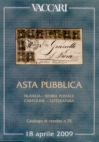 ZANARIA via S. Margherita 6, 20121 Milano tel. 02 8052427, fax 02 8051186 www.zanaria.com, email info@zanaria.com 1^ Asta pubblica di Filatelia, 28 marzo 2009, in occasione di Milanofil 2009 Lussuoso catalogo formato A4 interamente a colori, dove vengono proposti 1.060 lotti scelti di vario interesse. Molto precise le descrizioni e le evidenziazioni delle peculiarità dei vari pezzi. Presenti gli Antichi Stati Italiani con francobolli e lettere di Lombardo Veneto, Modena, Napoli, Parma, Stato Pontificio, Romagne, Sicilia, e Sardegna. In tutti si passa da pezzi classici di prestigio a documenti di grande interesse storico postale. Molti sarebbero i lotti da segnalare od evidenziare. Importante senza dubbio il Lombardo Veneto ed il periodo Risorgimentale. Poi una collezione di Roma 1870. Segue il Regno d’Italia, con i Matraire, la De la Rue, i francobolli di Servizio Soprastampati, Umberto I e Vittorio Emanuele III. Anche qui molti i pezzi esaltanti. Presente anche una eccezionale collezione di Buste Parlanti, Francalettere, Cartoline di Pubblicità. Non mancano diversi Servizi, Repubblica Sociale e Repubblica Italiana. Poi varie Occupazioni e Colonie Italiane. Fra gli Stati Esteri molto interessante l’Austria con anche un documento eccezionale: il lotto 1009, base € 10.000, una raccomandata del 1860 da Vienna a Milano affrancata con ben 28 esemplari del 15kr "testina". Poi Danimarca, Francia, Inghilterra, Svizzera... Inutile descrivere i pezzi principali o solo accennarli perchè l’elenco risulterebbe lunghissimo. Mi limito alla copertina dove figura il lotto 698, base € 50.000, l’unica Busta Parlante della serie 45 e al retro copertina dove sopra quartine nuove del 40c De la Rue, del ferro di cavallo II tipo e del III tipo senza sovrastampa, figura il lotto 323, base € 37.500, una lettera con uno splendido 6baj di Romagne, e sotto il lotto 561, base € 15.000, l’unica lettera nota affrancata per 20c con un francobollo da 10c De la Rue ed un segnatasse n. 2. |