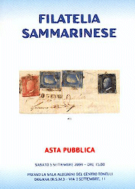 SAMMARINESE Piazza Enriquez 22, 47891 Dogana (RSM) tel. 0549.910225, fax 0549.909742 (prefissso dall'estero 00378) www.filsam.com, e-mail contact@filsam.com Asta pubblica del 5 settembre 2009 La seconda asta “estiva” della Filatelia Sammarinese si presenta con il suo pratico catalogo con in copertina il lotto 453, base € 4.000, una piccola lettera del 10 gennaio 1859 da Messina a Firenze con una affrancatura tricolore di “testoni” di Sicilia. In quest’asta vengono proposti 1.139 lotti. Inizia con delle simpatiche scatolette porta-francobolli e poi con una serie veramente notevole di francobolli, specialmente di Repubblica del primo periodo, in quartine, blocchi, anche fogli completi.Molto interessante anche San Marino. Poi le lettere. Qualche Prefilatelica, e documenti di Disinfezione e Sanità. Poi gli Antichi Stati Italiani, fra i quali notevoli Napoli, Pontificio e Toscana. Poi il Regno d’Italia con lettere affrancate specialmente di Vittorio Emanuele III. Quindi la Repubblica Italiana, con diverse lettere con vistose affrancature di Santa Caterina e del 100 lire Risorgimento. Poi San Marino anche con diverse lettere del 1800.Quindi Uffici all’Estero, Colonie ed Occupazioni, Posta Militare e Risorgimentale e, per finire, gli interi postali. |
