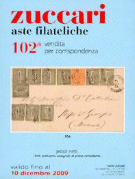 ZUCCARI via Crescimbeni 13, 62100 Macerata tel. e fax 0733.234828 102^ Vendita per corrispondenza a prezzi netti, valida fino al 10 dicembre 2009 Un migliaio di lotti sono quelli che ci presenta Nello Zuccari e sono tutti fotografati a colori. In copertina figura il lotto 934, a € 350, una lettera “semplice” del 1870 che con la sua bella affrancatura da 20 centesimi proprio semplice non è. Al retro di copertina il lotto 935, a € 660, un raro francobollo di Fiume, Reggenza del Carnaro. Il catalogo è ricco di documenti e lettere, Prefilateliche e degli Antichi Stati Italiani, specialmente dello Stato Pontificio. Molto buono anche il Regno d’Italia sia del 1800 che del 1900, in particolare gli ultimi anni con molte e varie interessanti offerte. Molto interessante anche Repubblica Sociale, Occupazioni, Uffici all’Estero. Molta Repubblica Italiana, soprattutto del primo periodo, con lettere anche con affrancature notevoli ed usi ricercati. Poi San Marino e Vaticano e tante anche le cartoline, pubblicitarie, commemorative, militari, paesaggistiche. |