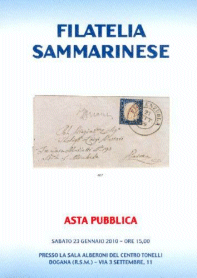 SAMMARINESE Piazza Enriquez 22, 47891 Dogana (RSM) tel. 0549.910225, fax 0549.909742 (prefissso dall'estero 00378) www.filsam.com, e-mail contact@filsam.com Asta pubblica sabato 23 gennaio 2010 a San Marino Questa prima asta “invernale” della Filatelia Sammarinese si presenta con il suo pratico catalogo con in copertina il lotto 467, base € 4.500, una piccola lettera del 27 settembre 1859 da Fiorenzuola a Parma affrancata con un 20c di Sardegna. In quest’asta vengono proposti 1.142 lotti. Inizia con “Lotti e Collezioni” fra le quali una di C.L.N. ed un’altra del Corpo Polacco. Poi con francobolli degli Antichi Stati Italiani e del Regno d’Italia con Occupazioni (Cefalonia ed Itaca in particolare) e Colonie Italiane. Molto interessante anche San Marino. Poi le lettere. Molte Prefilateliche e documenti di Disinfezione e Sanità. Poi gli Antichi Stati Italiani, fra i quali notevoli il Lombardo Veneto (anche con parecchie raccomandate), Napoli, Pontificio, Sardegna e Toscana. Poi il Regno d’Italia con buon assortimento sia del 1800 che del 1900. Interessanti anche la Posta Aerea, le Colonie, le Collettorie, il periodo Risorgimentale, le Vie di Mare. In chiusura numerosi Interi postali. |