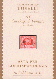 TOSELLI via Matteotti 143, 18038 San Remo IM tel. 0184.531528, fax 0184.570366 www.toselli.com, e-mail toselli@toselli.com 95^ Asta per corrispondenza, chiusura 26 febbraio 2010 Elegante catalogo in carta patinata con illustrazioni tutte a colori comprendente 1.659 lotti. In copertina il lotto 716, base € 10.000, uno dei quattro esemplari noti del francobollo da 10 cent. di San Marino del 1892 con sovrastampa capovolta. Al retro di copertina il lotto 768, base € 14.500, due rari foglietti Paesaggi del 1949 di San Marino. Nelle copertine interne un blocco usato di 47 esemplari del 100 lire Democratica e belle buste di Posta Aerea. In questo catalogo spiccano, dopo numerose lettere prefilateliche e di navigazione, gli Antichi Stati Italiani, il Regno d’Italia (con i vari Servizi), Colonie, Occupazioni, Repubblica Sociale, Repubblica, San Marino e Vaticano. Non mancano buoni francobolli di Stati europei e Colonie Inglesi. Prosegue anche in questo catalogo è l’offerta di Posta Aerea ed Aerogrammi, specialmente del Regno d’Italia e delle Colonie Italiane. Molto assortiti anche gli aerogrammi Zeppelin con provenienze e destinazioni affatto comuni. Notevoli certi pezzi di Posta Spaziale. Le proposte si chiudono con Etichette e Cartoline. |