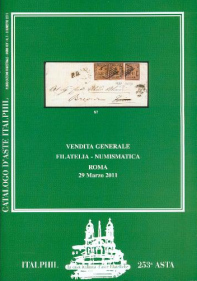 ITALPHIL Piazza Mignanelli 3, 00187 Roma RM tel. 06.6787617, 06.69940468, fax 06.6794045 www.italphil.org, e-mail info@italphil.org 253^ Asta del 29 marzo 2011 a Roma Asta con 724 lotti di Filatelia e 86 di Numismatica presentata nel consueto, elegante catalogo con allegato fascicolo con nitide riproduzioni a colori. In copertina il lotto 87, base € 15.000, una letterina da Bologna 11.10.1859 affrancata con tre 4 bai di Romagne per Torino. La 253^ asta Italphil inizia con una Vendita Generale nella quale sono offerti lotti di Antichi Stati Italiani (specialmente Napoli e Sicilia) e prosegue con il Regno d’Italia e Repubblica Italiana. Non mancano cartoline e tematiche ed anche un po’ di Europa. |