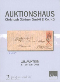 MERKURPHILA Businnes Park 4, A–8200 Gleisdorf, Austria www.merkurphila.at, email office@briefmarkenshop.at 8° Asta del 26 giugno 2011 Catalogo in formato A4, tutto a colori nel quale vengono proposti 1.769 lotti. In copertina il lotto 1010, base 3.800 €, una raccomandata del 1867 da Vienna a Roma diretta a Papa Pio IX. Catalogo in gran parte dedicato all'Austria con annullamenti su frammento e su lettera delle varie regioni del vasto Impero Austriaco, compreso il Tirolo ed anche il Lombardo Veneto. Segue poi ancora Austria fino ad arrivare, dopo il 1945, alla Repubblica. Quindi la Germania, poi l'Europa ed il resto del Mondo, dove si può trovare qualche lotto più specificatamente italiano. |