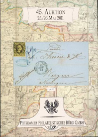 POTSDAMER Philatelistisches Buero Gmbh Apfelweg 12, D – 14469 Potsdam www.potsdamer-phila-buero.de, email auktion@potsdamer-phila-buero.de 45° Asta. 25 e 26 maggio 2011 Catalogo particolarmente ricco, in carta patinata, tutto a colori, molto elegante e curato, comprendente 2.407 lotti. In copertina, sullo sfondo di una carta postale tedesca, figura il lotto 77, base € 3.000, una lla lettera del 1854 dalla Sassonia per la Norvegia. Il catalogo comprende lettere e francobolli soprattutto dell'area tedesca, ma può interessare il collezionista italiano anche per le destinazioni delle lettere e le descrizioni fatte con puntuali evidenze storico postali. Dopo lettere transitate attraverso diversi Stati (in genere ante UPU) e Posta Militare Classica (anche questa in genere prima del 1870) dai vari Stati Tedeschi e per l'estero, sono dettagliate prefilateliche ed affrancate di Stati Tedeschi, in ordine alfabetico, da Baden e Bayern a Thurn & Taxis e Wuerttemberg passando per Bremen, Hannover, Oldengurg…. Prosegue poi con Impero Tedesco e Deutsches Reich fino al 1945 con le varie Colonie ed Occupazioni (fatte o subite dalla Germania). Quindi le due repubbliche tedesche del dopoguerra per arrivare fino, quasi, ai giorni nostri. Alla fine molti lotti di raccolte e collezioni, soprattutto dell'area tedesca, ma anche d'Europa ed Oltremare. |