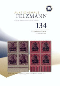 FELZMANN Auktionshaus Ulrich Felzmann GmbH & Co GK Immermannstrasse 51, D-40210 Duesseldorf (Germania) www.felzmann.de, e-mail info@felzmann.de 134° Asta dal 10 al 12 novembre 2011 Tre i cataloghi di quest’asta, tutti in formato A4, in carta patinata, naturalmente a colori. Un catalogo è interamente dedicato all’Area Italiana. Sono oltre 1.000 lotti singoli e di collezioni, presentati con la collaborazione di Alessandro Arseni e Innocenzo Gentile. In copertina ha una circolare con una Croce di Savoia di Napoli del 1860 ed inizia con Levante Austriaco, Lombardo Veneto, poi Pontificio e Regno d’Italia con molte rarità sia del’’800 che del ‘900. Ben offerti anche i Sevizi, Pacchi Postali, Segnatasse, Pubblicitari, BLP, ed anche RSI, Repubblica Italiana. Poi Occupazioni, Uffici all’Estero, Colonie ed anche San Marino e Vaticano. Un secondo catalogo è per la Posta Zeppelin e sono altri 1713 lotti di tutto il mondo, con diversi documenti dell’Area Italiana. Un terzo catalogo generale, di più alto spessore, raccoglie altre migliaia di lotti, anche questi di tutto il mondo, ma di Germania e dell’area tedesca in particolare. |
