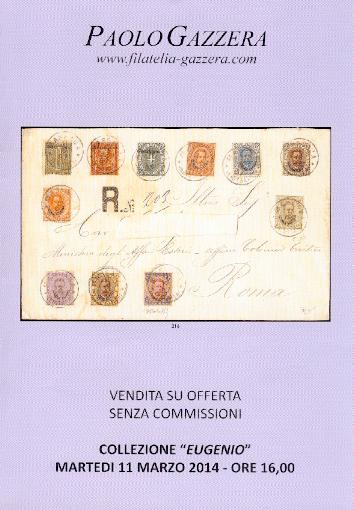 Paolo Gazzera Viale Porta Piacentina 47, 10024 Moncalieri TO, tel/fax 01.16.40.77.60, www.filateliagazzera.com, contact@filateliagazzera.com. Vendita su offerta. Collezione “Eugenio”. Chiusura martedì 11 marzo 2014. Catalogo in formato A4 tutto a colori. Sono solo 280 lotti, ma quella offerta è veramente una vasta collezione di chi dev’essere stato un buon ed attento filatelista. In copertina il lotto 216, base € 1.500, una busta del 1897 affrancata con gli 11 valori di Umberto I d’Eritrea. Al retro di copertina, il lotto 35, base € 1.000, una bustina del 1869 per Montevideo con una affrancatura tricolore di Pontificio, una bella tricolore da Napoli, una busta da Tripoli con la serie Calcio del 1934, interessanti tassate, il raro foglietto Somalia AFIS del Consiglio del 1951. Le proposte iniziano con i primi decreti postali del Regno d’Italia, Poi Antichi Stati Italiani, tutti, con specialmente Lombardo Veneto, Pontificio e Sardegna. Poi Regno d’Italia del 1800, ma anche del 1900. Numerosi sono anche in questo settore i francobolli e le lettere raggruppare in lotti, forse non numerosi, ma senz’altro interessanti. Si prosegue poi con la Repubblica Sociale Italiana, la Luogotenenza e la Repubblica per arrivare quasi ai nostri giorni. Da non trascurare i varo Servizi, poi Vaticano e San Marino e tutta l’area delle Colonie e dei Possedimenti italiani. Vi è anche un settore “Ultimi arrivi” con altre interessanti proposte. Da tenere presente che la vendita è senza commissioni. |