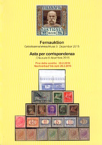 Auktionshaus H. D. Rauch GmbH Graben 15, A 1014 Wien, www.hdrauch.com, austro@hdrauch.com. 165ª Asta giovedì 3 dicembre 2015 a Vienna. Elegante catalogo in carta patinata comprendente 1.452 lotti, ben dettagliati in un chiaro elenco iniziale. Le offerte iniziano con 240 lotti di Europa ed Oltremare, fra i quali una ventina di italiani, con anche Occupazioni, San Marino e Vaticano. Poi più di cento lotti di Germania. La maggior parte dei lotti offerti in quest’asta sono rappresentati dall’Austria e dall’area dell’Impero Austriaco. Si parte dai documenti antichi e la prefilatelia, poi le classiche prime emissioni con molti annullamenti di ottima qualità. Poi il 1900 con la 1° Guerra Mondiale ed il periodo più moderno anche con la Repubblica dal 1945. Compresi nella parte austriaca vi sono anche diverse decine di lotti di Lombardo Veneto. Chiudono le offerte di cartoline, di Letteratura e di Lotti e collezioni. |