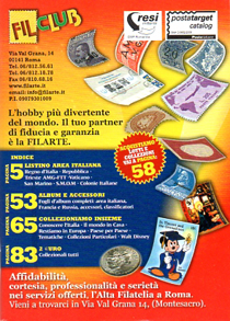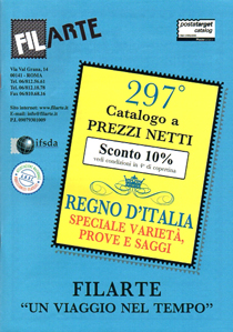 FilarteVia Val Grana 8, 00141 Roma, tel. 06.81.25.661, fax 06.81.06.816, www.filarte.it, info@filarte.it. 297° Catalogo a PREZZI NETTI sconto 10% Regno d’Italia Speciale Varietà, Prove e Saggi. Catalogo in formato A4 con illustrazioni tutte a colori nel quale vengono proposti 1.100 lotti. Le proposte riguardano francobolli del Regno d’Italia, dal 1861 al 1946 con commemorativi, posta aerea, espressi, pacchi, segnatasse, BLP, pubblicitari.. Un’offerta particolarmente ampia e dettagliata. |
