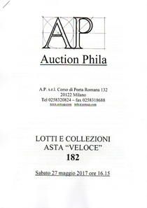 AP srl Auction Phila Corso di Porta Romana 132, 20122 Milano tel. 02.58.32.08.24, fax 02.58.31.86.88, info@asteap.com, www.asteap.com Asta veloce 182. Sabato 27 maggio 2017 a Milano. Una dozzina di fogli fermati da un punto metallico. 579 lotti di collezioni, album, scatoloni di francobolli e lettere dell’area italiana, Antichi Stati compresi, ma anche di tutto il mondo. Il catalogo è consultabile anche sul sito con possibilità di scaricarlo in formato PDF. Inoltre i lotti con base uguale o superiore a € 500 sono stati fotografati e sono visibili sul catalogo on-line. L’AP resta comunque a disposizione per scansioni, fotocopie, informazioni. Si può provare ad acquistare “al buio”sperando, e spesso capita, di trovare il biglietto vincente, oppure ci si può divertire ad esaminare questi ammassi di roba e “pescare” sul sicuro. Certo che il materiale è tanto e di tutti i generi.. |