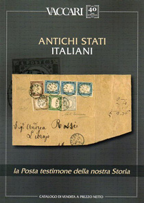 Vaccari srlvia Buonarroti 46, 41058 Vignola MO, tel. uf. 05.97.71.251, 05.97.64.106, fax 05.97.60.157, info@vaccari.it , www.vaccari.it Vendita a prezzo netto di Antichi Stati Italiani. Catalogo di vendita n. 92. Paolo Vaccari propone questa volta una vendita al primo richiedente, quindi occorre …affrettarsi! Il catalogo è, come al solito, preciso e ben illustrato e vi è pure un dettagliato indice che aiuta nella rapida ricerca dei vari settori. In copertina il lotto 404, prezzo a richiesta per la gran parte di un plico da Livorno a Milano del 1862 affrancato per ben 3,76 lire (188 porti di stampati!) con una affrancatura pentacolore comprendente il 3 lire e l’1 centesimo. Al retro di copertina, altri “lotti forti” come il 149, anch’esso prezzo a richiesta per una lettera da Aulla con un 40 c del Governo Provvisorio di Modena, il lotto 462, a € 7.500 una lettera del 1858 da Livorno ad Alessandria d’Egitto con una affrancatura tricolore di francobolli di Toscana. Le proposte di vendita iniziano con un buon Lombardo Veneto, naturalmente molto Modena e veramente tanto Napoli. Molto buoni anche Parma e Pontificio. Poi Regno di Sardegna e una bella Sicilia. Ottima anche la Toscana. Particolare da non trascurare è che da Vaccari i lotti di valore superiore a 500 euro vengono gratuitamente corredati dal certificato di garanzia Vaccari srl. |