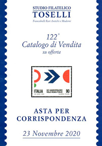 Toselli studio filatelico via Matteotti 143, 18038 San Remo IM, tel. uf. 01.84.53.15.28, fax 01.84.57.03.66, toselli@toselli.com,www.toselli.com 120° Catalogo di Vendita a prezzi netti Proposte di Filatelia Pregiata - Inverno 2020. Catalogo nel quale vengono presentati 426 lotti scelti. In copertina rari francobolli italiani. Al retro di copertina gli ultimi due lotti, per entrambi prezzo a richiesta: due buste di spedizioni lunari, una dell’Apollo 12, l’altra dell’Apollo 16. Molte le offerte di francobolli e qualche lettera di Antichi Stati Italiani, in particolare Napoli, Pontificio, Toscana. Poi tanto Regno d’Italia del 1800 e 1900 con molta Posta Aerea, i vari Servizi, BLP, Pubblicitari... Poi GNR, Repubblica Sociale, tanta Repubblica Italiana, San Marino. Quindi Vaticano, Occupazioni, Ufficio all’Estero, parecchie Colonie. Segue il vasto settore della Posta Aerea, Italiana (con anche tanti Trittici), diverse buste dalle Colonie, ma anche Zeppelin da San Marino e Paesi europei, Posta Razzo e Spaziale. |