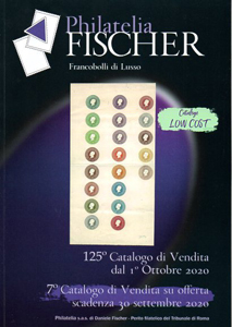 Philatelia sas di Daniele Fischervia Torino 160/1/2, 00184 Roma RM, tel. uf. 06.47.43.574, fax 06.48.80.159, fischer@filatelia.ws, www.filatelia.ws. 7° Catalogo di vendita su offerta (senza commissioni) scadenza 30 settembre 2020 125° Catalogo di vendita (a prezzi netti) dal 1° ottobre 2020 Si compone di 992 lotti particolarmente selezionati e di 8 lotti di accumuli in vari scatoloni per arrivare al numero tondo 1.000. Daniele Fischer, causa covid, lascerà il negozio di via Torino. Regala classificatori e liquida parte del suo magazzino a prezzi d’occasione. Le varie offerte sono proposte in modo spontaneo e con una grafica attraente. Simpatico l’intercalare di specie di foglietti di appunti con notiziole spicciole di Filatelia o Storia Postale. In copertina il lotto 360, base € 5.000, un foglio con 21 impronte in colori diversi col profilo di Vittorio Emanuele II della De La Rue. Al retro copertina e in 2a e 3a, rari francobolli d’Italia, di Occupazioni e Colonie italiane, un aerogramma De Pinedo ed una particolare busta con un Gronchi Rosa. Le proposte iniziano con offerte molto varie di tutti gli Antichi Stati Italiani con in particolare Pontificio. Segue Regno d’Italia sia 1800 che 1900 con molti francobolli rari, anche di Posta Aerea, BLP, Pubblicitari. Molte varietà, prove e saggi. Vi è anche Repubblica Italiana, tante Occupazioni e Colonie, San Marino, Vaticano. Non mancano i classici Paesi Europei, fra i quali Francia, Russia ed anche Israele e Capo di Buona Speranza. |