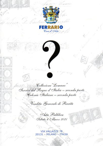 Ferrario Aste srl Via Vallazze 78, 20131 Milano, tel. 02 49 53 57 20, info@ferrarioaste.com, www.ferrarioaste.com Asta pubblica sabato 6 marzo 2021 Collezione “Lemano”, Servizi del Regno d’Italia, Colonie Italiane Vendita Generale di Rarità Un grande ? punto di domanda in copertina per domandarsi come andrà l’asta, come andrà il covid o come andranno le cose in generale? Sono 969 i lotti che andranno battuti in un un’unica sessione d’asta. La vendita inizia con gli Antichi Stati Italiani (tutti!), in particolare Lombardo Veneto con anche il lotto 12, base € 15.000. per un blocco nuovo di 24 francobolli da 15 c.a., poi, in ordine alfabetico, diverso Modena, numeroso Napoli e Provincie Napoletane con anche il lotto 95, base € 17.500, una coppia della Crocetta su fascetta, Parma dove si distingue il lotto 123, base € 50.000, la lettera del 1855 affrancata anche con una coppia della prova di stampa del 15 cent, parecchio Stato Pontificio dove si fa notare il lotto 153, base € 40.000, una fascetta del 1869 affrancata con due francobolli da 3 cent. grigi. Dopo le Romagne una buona Sardegna e la Sicilia, dove fa spettacolo il lotto 228, base € 30.000, una lettera con sei diversi francobolli (a completare la serie mancherebbe soltanto il ½ grano). Cose interessanti anche in Toscana È la volta poi del Regno d’Italia del 1800 e 1900. Veramente tanti francobolli con Posta Aerea ed Espressi, Segnatasse, BLP, Pubblicitari, Parastatali… Qui si distinguono una serie di bozzetti di Corrado Mezzana . Segue tanto Fiume e parecchie Colonie e Occupazioni. |
