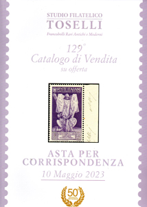 Toselli studio filatelico via Matteotti 143, 18038 San Remo IM, tel. uf. 01.84.53.15.28, fax 01.84.57.03.66, toselli@toselli.com,www.toselli.com 129° Catalogo di Vendita su offerta Asta per Corrispondenza 10 maggio 2023. Roberto e Monica Toselli festeggiano con questo catalogo il 50° anno di attività e lo fanno proponendo una selezione di rarità che verranno vendute a trattativa privata. Fra esse la copertina: l’”Augusto violetto” del 1937. Poi il catalogo prosegue con la presentazione di altri 1.914 lotti. dagli Antichi Stati Italiani allo Spazio. Molte le offerte di francobolli e lettere di Lombardo Veneto, Modena, diverso Napoli, Parma, molto Pontificio, parecchia Sardegna e francobolli di Sicilia e di Toscana. Poi tanto Regno d’Italia del 1800 e 1900 con molta Posta Aerea, Segnatasse , BLP, Pubblicitari... Poi Repubblica Sociale Italiana, diversa Repubblica Italiana con 100 lire Democratica e Gronchi rosa, San Marino con rari francobolli e foglietti e Vaticano. Poi Occupazioni e molte Colonie. Segue Oltremare e Colonie inglesi. Quindi il vasto settore (più di 500 lotti!) della Posta Aerea con buste anche dalle Colonie, da Vaticano, da San Marino, un po’ da tutto il mondo. |