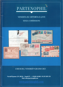 Partenophil Via Dell’Epomeo 219, 80126 Napoli, tel. 081.64.24.08, www.partenophil.com, info@partenophil.com. Vendita su offerta E-LIVE senza commissioni. Chiusura venerdì 9 giugno 2023 Catalogo in formato A4 tutto a colori di 48 pagine dove Gennaro Todisco propone 739 lotti di francobolli, lettere e collezioni. Pezzi di Antichi Stati Italiani, Regno d’Italia, Repubblica Sociale e Repubblica Italiana, Occupazioni e Colonie Italiane, San Marino, Vaticano. Non mancano documenti particolari fra i quali il lotto 055, una cartolina postale da Cefalù 1 gennaio 1874, primo giorno d’uso di questi cartoncini che sarà poi diffusissimo.