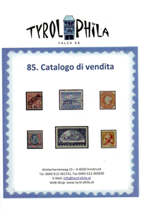 Tyrol Phila Falch kg Wetterherrenweg 23, A – 6020 Innsbruch, tel. 0043.512.361.532, fax 0043.512.365.630, www.tyrol-phila.at, info@tyrol-phila.at Catalogo di Vendita a prezzo fisso 85. Senza commissioni. Catalogo formato A5 di 52 pagine interamente a colori. Inizia con 15 pagine di francobolli nuovi ed usati di Germania, dagli Antichi Stati Tedeschi alla 2a Guerra Mondiale. Anche DDR. Poi 3 pagine di Svizzera e 5/6 pagine di francobolli nuovi ed usati di Impero Austriaco ed Austria dal 1850 ai giorni nostri con anche Lombardo Veneto e Levante. Anche 6 pagine d’Italia con Occupazioni, Uffici all’Estero, Colonie, Segnatasse di Bolzano. Chiudono le proposte di lotti e collezioni. |