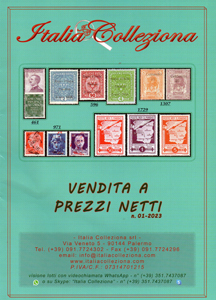 Italia Colleziona srl Via Veneto 5, 90144 Palermo, tel 091.7724302, info@italiacolleziona.com, www.italiacolleziona.com Vendita a Prezzi netti 01-2023. Catalogo in formato A4 di 112 pagine con in copertina e al retro rari francobolli e lettere dell’area italiana e europea. Sono offerti 2.864 lotti di francobolli di Antichi Stati Italiani, del Regno d’Italia, con Posta aerea e Servizi. Anche Repubblica Sociale Italiana, Occupazioni, Uffici all’estero, tante Colonie, in particolare Terre Redente, segnatasse Trentino e Bolzano, Fiume. Molta Repubblica Italiana, Trieste e un buon assortimento di San Marino e Vaticano, “Area mondiale” con in particolare Colonie inglesi, Monaco, USA. Poi quasi duecento lotti di “Storia postale” dei settori su nominati. E in chiusura 163 lotti di Lotti di collezioni e accumulazioni con centinaia d’album con francobolli di tutto il mondo a prezzi veramente invitanti. |