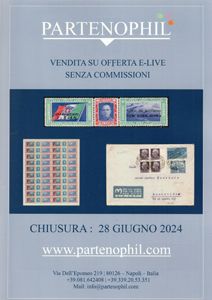 Partenophil Via Dell’Epomeo 219, 80126 Napoli, tel. 081.64.24.08, info@partenophil.com, www.partenophil.com Vendita su offerta E-LIVE senza commissioni. Chiusura 28 giugno 2024 Catalogo in formato A4 tutto a colori dove Gennaro Todisco propone 591 lotti di francobolli, lettere e collezioni di Antichi Stati Italiani, Regno d’Italia, Repubblica Sociale e Repubblica Italiana, Occupazioni e Colonie Italiane, San Marino, Vaticano. Anche lettere prefilateliche, stati esteri come Grecia, Germania, Francia, Svizzera, Colonie inglesi. E una cinquantina di lotti e collezioni a prezzi veramente convenienti. |