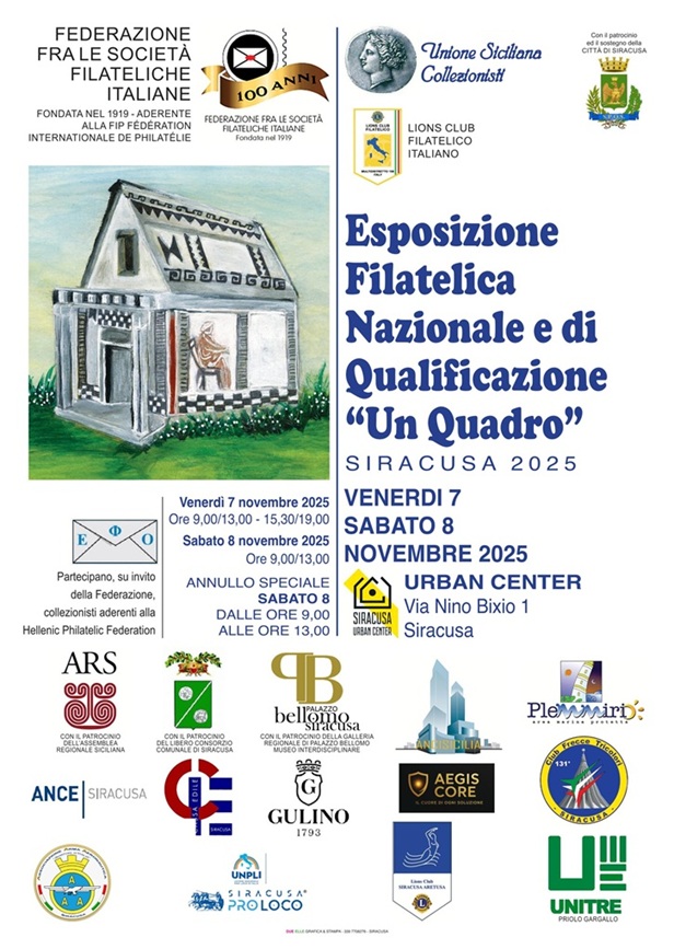 La Federazione fra le Società Filateliche Italiane, in collaborazione con l'Unione Siciliana Collezionisti, Via Padova 26, 96100 Siracusa (SR) ed il Lions Club Filatelico Italiano, organizza SIRACUSA 2025, Esposizione nazionale e di qualificazione per collezione 1 quadro, dal 7 al 8 novembre 2025, a Siracusa, presso l’Urban Center – Via Nino Bixio, 1. Ospite d'onore: Federazione greca. ORARI DI APERTURA Venerdì 7 novembre ore 09:00 – 13:00 e 15:30 – 19:00 Sabato 8 novembre ore 09:00 – 13:00 e 15:30 – 17:00 SEZIONI Esposizione nazionale (EN): -> Esposizione nazionale 1 quadro. Esposizione di qualificazione (EQ): -> Esposizione di qualificazione 1 quadro. CLASSI - Aerofilatelia - Astrofilatelia - Filatelia fiscale - Filatelia tematica - Filatelia Tradizionale classica ( min. 1900) - Filatelia Tradizionale moderna (1900-1945) - Filatelia Tradizionale contemporanea (>1945) - Filatelia Tradizionale diacronica - Interofilia - Maximafilia - Storia postale classica (min. 1900) - Storia postale moderna (1900-1945) - Storia postale contemporanea (>1945) - Storia postale diacronica - Filatelia aperta Vi aspettiamo numerosi! |