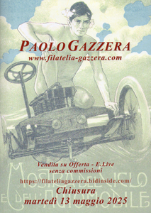 Paolo Gazzera Viale Porta Piacentina 47, 10024 Moncalieri TO, tel/fax 01.16.40.77.60, https://filateliagazzera.bidinside.com/ Vendita su Offerta - E. Live senza commissioni. Martedì 13 maggio 2025 Copertina come al solito originale con la gigantografia del lotto 45, una cartolina del 1905 della Mostra del Ciclo e dell’Automobile di Milano Catalogo dove sono proposti 1.166 lotti singoli, 88 lotti di Lotti e collezioni e 7 lotti di Album e materiale filatelico. Le proposte iniziano con 62 lotti di vecchie cartoline, diverse piemontesi, illustratori, militari, autografi. Poi Prefilateliche, Navigazione, Ferrovie con bolli particolari. Quindi francobolli e lettere di Antichi Stati Italiani, specialmente Pontificio, tanta Sardegna e parecchia Toscana. Viene poi dispersa in 184 lotti la Collezione Nembrini delle relazioni postali fra Italia e Francia dal 1850 al 1875. Una raccolta e uno studio meritevoli di un attento esame. Quindi tanto Regno d’Italia, tutti e tre i re, ma soprattutto di francobolli e buste di Vittorio Emanuele III con diversa Posta Aerea. Poi annullamenti di Vittorio Emanuele II, diversi Interi Postali. Poi Luogotenenza, Repubblica, Occupazioni, Uffici all’Estero e molte Colonie. Poi parecchi francobolli e foglietti di San Marino e buste di Vaticano. In chiusura Europa, in particolare Gran Bretagna, e Russia e alla fine Posta Aerea e Posta Militare |