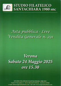 Studio Filatelico Santachiara 1980 sncviale 4 novembre 4, 42121 Reggio Emilia RE, tel. uff. 05.22. 45.59.66, fax 05.22.43.01.46, info@sergiosantachiara.com, www.sergiosantachiara.com. Asta pubblica - Live Vendita Generale n. 291. sabato 24 maggio 2025 a Verona Lo studio Santachiara 1980 ripete il tradizionale appuntamento del sabato pomeriggio alle 15.30 all’Hotel Ramada Fiera. Catalogo di vendita elegante e pratico che presenta 863 lotti tutti fotografati. Un bel assortimento per soddisfare tante richieste collezionistiche e per tutte le tasche, con parecchie rarità e “chicche” che lascio a voi scoprire. Inizia, con i vari settori ed argomenti evidenziati in rosso, con molte interessanti Prefilateliche italiane ed estere, poi Sanità, documenti Militari - Risorgimentali, Vie di Mare e Lacuali, bolli Ferroviari, Diligenze. Poi un po’ di Lotti di francobolli, di lettere e di documenti. Quindi gli Antichi Stati italiani, tutti, ma in particolar modo Lombardo Veneto con annullamenti anche dopo il 1859 su francobolli sardi e dopo il 1866 su francobolli italiani. Poi un po’ di Modena, parecchio Napoli e Provincie Napoletane, un interessante Parma, molto Pontificio con annullamenti e tante, veramente tante Romagne, anche queste con annullamenti su francobolli sardi ed italiani. Poi molta Sardegna, Sicilia e Toscana tutte con belle lettere. Segue il Regno d’Italia con molte lettere e documenti di Vittorio Emanuele II e di Umberto I con la presenza di diverse “chicche”anche di Vittorio Emanuele III Poi parecchia RSI, Luogotenenza, Emergenza. Quindi Repubblica Italiana. Segue Posta Aerea, Segnatasse, Pubblicitari, Prigionieri di guerra. Quindi le Colonie (AOI, Cirenaica, Eritrea, Etiopia, Libia, Somalia, Tripolitania, Fezzan), Egeo e Uffici all’Estero, Fiume, parecchie Occupazioni. Trieste, San Marino,e qualche Paese europeo. |