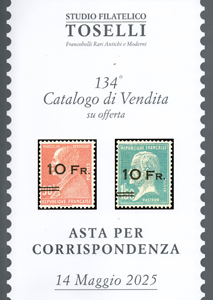 Toselli studio filatelico via Matteotti 143, 18038 San Remo IM, tel. uf. 01.84.53.15.28, fax 01.84.57.03.66, toselli@toselli.com,www.toselli.com 134° Catalogo di Vendita su offerta Asta per Corrispondenza 14 maggio 2025. In copertina due rari francobolli francesi Ile de France 1928: lotto 1161 base 8.000 €. Sono 1677 i lotti di questo catalogo che vanno dalle Prefilateliche e dagli Antichi Stati allo Spazio. Inizia con offerte di francobolli e lettere di Lombardo Veneto, Modena, diverso Napoli, un po’ di Parma, molto Pontificio e Romagne, parecchia Sardegna, poi francobolli di Sicilia e di Toscana. Segue tanto Regno d’Italia del 1800 e 1900 con molta Posta Aerea, Segnatasse, BLP, Semistatali, Pubblicitari... Poi Repubblica Sociale Italiana, diversa Repubblica Italiana con un paio di Gronchi Rosa, San Marino con rari francobolli e tanti foglietti, Occupazioni, Uffici all’estero e molte Colonie. Segue Europa, in particolare Francia e Monaco. Poi Oltremare e Colonie inglesi. Quindi il vasto settore (più di 200 lotti!) della Posta Aerea con buste e documenti anche dalle Colonie, da Vaticano e un po’ da tutto il mondo. |