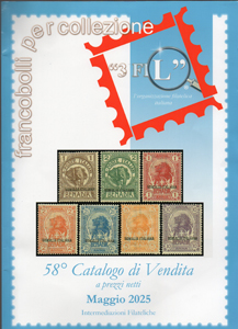 3 Fil s.r.l. “l’organizzazione filatelica italiana” Bari-Teramo Via della Pescara 16, 64100 Teramo, tel. 0861 249 324 Via Calefati 94, 70122 Bari, tel. 080 521 68 51 58° Catalogo di vendita a prezzi netti Maggio 2025 Catalogo di 90 pagine dove vengono presentati 853 lotti. Un centinaio di lotti di francobolli di Lombardo Veneto, Italia Regno con Posta Aerea (trittici in fogli), Segnatasse, BLP. Tanta Repubblica con buste con belle affrancature dei primi commemorativi, Gronchi Rosa compreso. Segue San Marino con prime serie e foglietti. Quindi Occupazioni e Colonie. Tanti francobolli dei primi di Portogallo, Spagna, Svizzera, Cina, Colonie francesi e inglesi, Israele. |