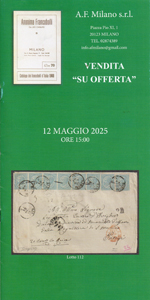 Vendita “su offerta” lunedì 12 maggio 2025 al maggior offerente, senza commissioni. Catalogo che propone 112 lotti in gran parte di francobolli e lettere scelte. In copertina il lotto di coda 112, base € 14.000 una spettacolare lettera del 1864 per Parigi bollata a Rimini con al retro il suggello di San Marino. La vendita inizia con Lombardo Veneto, Modena, Napoli, Pontificio e Sardegna, dove emerge il lotto 19, base € 30.000, la lettera del 1858 con il francobollo da 40 c con effigie capovolta. Poi Regno d’Italia con diversa Posta Aerea e Repubblica i primi anni con quartine nuove dei francobolli più rari, Gronchi Rosa compreso, Quindi un po’ di Libia e San Marino con anche il lotto 109, base € 6.000, una lettera del 1864 per Venezia ancora austriaca. |