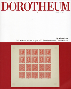 Dorotheum Dorotheergasse 17, A-1010 Wien, tel +43 151560297, stamps@dorotheum.at, www.dorotheum.com Briefmarken 7162 Asta anche online 11 e 12 giugno 2025, in Palais Dorotheum a Vienna 797 lotti in un elegante catalogo con in copertina il lotto 364, base 3.000 €, un raro foglietto di prova del 1916. Le proposte iniziano con francobolli degli Antichi Stati Tedeschi, poi del Reich con Occupazioni, specialmente in Cina, fino al 1945. Poi Francia e stati europei, una decina di lotti d’Italia, Antichi Stati, Regno e Repubblica, San Marino e Vaticano. Seguono Liechtenstein, Gran Bretagna, Svizzera, Cina e USA A metà catalogo inizia l’Austria con tutte le emissioni con tanti francobolli e qualche lettera. In particolare una fascetta con un raro Mercurio rosa (lotto 299, base € 9.000). Dopo l’Impero austriaco, la Repubblica fino al periodo hitleriano e anche quello successivo. Presenti anche saggi e prove, segnatasse e documenti militari della 1a GM. Alla fine anche un po’ di francobolli di Lombardo Veneto. |