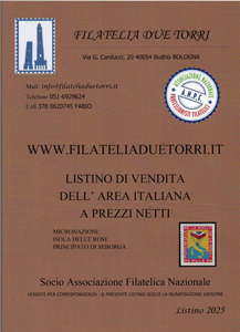 FILATELIA DUE TORRI di Orlandini F. & c sas Via Carducci 20, 40054 Budrio BO, tel 051 692 96 24, cell Massimo Orlandini 345 907 566 02, cell Fabio Orlandini 333 189 44 54, www.filateliaduetorri.it, info@filateliaduetorri.it Listino 2025 di Vendita dell’Area italiana a Prezzi netti. Un centinaio di pagine dove sono specializzati l’Isola delle rose ed il Principato di Seborga. Ma tantissimi sono i francobolli dell’intera Area italiana, dagli Antichi Stati al Regno per arrivare fino ai nostri giorni. Quindi CLN, Corpo polacco, Vittime politiche, Trieste A e B, Campione, Occupazioni, Fiume, Uffici all’Estero, Colonie. Focus particolare su Repubblica con le varie specializzazioni. Notevoli anche le offerte di San Marino, Vaticano, SMOM. Gli Orlandini sono presenti ai convegni di Modena, Piacenza e in particolare a quello di Bologna del 3 e 4 ottobre 2025 e di Verona del 20/22 novembre 2025. |
