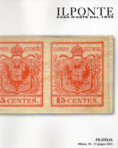 Il Ponte – Casa d’Aste srl Via Pontaccio 12, 20121 Milano, tel 02 72 02 20 83, filatelia@ponteonline.com, www.ponteonline.com Asta 713 di Filatelia 10 e 11 giugno 2025 Per corrispondenza, telefono o online. Commissioni 26% + 3% o 5% con internet. Alberto Coda Canati in questa asta presenta pezzi eccezionali come il lotto 90 di copertina, stima € 3.000/4.000, una striscia di tre del 15c di Lombardo Veneto con bollo “Motta 1 giu” (1850), il lotto 184 di seconda pagina, stima € 40.000/60.000, una lettera da Milano 31 dicembre 1858 con un 10 s e tre 5 c nell’ultimo giorno di validità e il lotto 269 di terza di copertina, stima € 50.000/70.000, una raccomandata del 1869 da Costantinopoli per Roma affrancata per 345 soldi austriaci e poi tassata per 5 scudi. Altri pezzi di rilievo sono presenti in questa “Raccolta Annamaria di Lombardo Veneto e Levante austriaco” dove sono evidenziate le affrancature bicolori e tricolori, i colori, gli angoli di foglio, le strisce, i blocchi, le croci di sant’Andrea, le date d’uso, le miste, i falsi della prima emissione. Stessa “musica” con le emissioni successive, come il lotto 152, stima 4.000/6.000 ina busta da Brescia con un 10 soldi in data 1° novembre 1858, primo giorno o con tanti rari annullamenti. E poi il Levante austriaco con lettere da Bulgaria, Romania, Egitto, Libano, Turchia. Seguono proposte di Sicilia, Regno d’Italia, RSI, Colonie, San Marino ed anche di Estero, in particolare Francia e un cosmogramma del 1971 in cofanetto Bolaffi. Chiudono la vendita le proposte di 62 Lotti e collezioni in genere dei temi sopra nominati. |