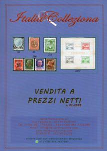 Italia Colleziona srl Via Veneto 5, 90144 Palermo, tel 091.7724302, info@italiacolleziona.com, www.italiacolleziona.com Vendita a Prezzi netti 01 - 2025 Catalogo in formato A4 di 90 pagine con in copertina e al retro rari francobolli dell’area italiana e europea. Sono ben 2.395 lotti di francobolli nuovi ed usati di Antichi Stati italiani, del Regno d’Italia, con Posta aerea e Servizi. Anche Repubblica Sociale Italiana, Occupazioni, Uffici all’estero, tante Colonie, in particolare Terre Redente, segnatasse Trentino e Bolzano, Fiume. Molta Repubblica Italiana, anche in quartine, Trieste e un buon assortimento di San Marino e Vaticano, “Area mondiale” con in particolare Austria, Francia, Svizzera, Giappone, Colonie inglesi, USA. E in chiusura 78 lotti di Lotti di collezioni e accumulazioni con centinaia d’album con francobolli di tutto il mondo a prezzi veramente invitanti. |