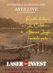 Laser Invest srlvia Londra 12/14, 46047 Porto Mantovano MN, tel. uf. 03.76.39.99.01, fax 03.76.38.57.75, cell. 33.97.95.08.33, www.laserinvest.com. SHOW ROOM a Milano, Galleria Unione 5, tel 02 8412 0035 Asta 189 LIVE e per corrispondenza domenica 15 giugno 2025 ore 14 Con in copertina l’ingigantimento di una cartolina con monoplano e “Rarità italiane e Le Cartoline di Fiorenzo Longhi” (seconda parte). Inizia con la presentazione del catalogo di Franco Filanci e Domenico Tagliente “Classici d’Italia” acquistabile anche direttamente da info@laserinvest.com. I 446 lotti iniziano con francobolli e lettere di tutti gli Antichi Stati italiani. Poi Regno d’Italia con grandi affrancature e Repubblica Sociale Italiana, CLN, Repubblica Italiana, Occupazioni straniere e italiane, Colonie italiane. Poi molti lotti di “Le Cartoline di Fiorenzo Longhi” con Precursori e Circuiti aerei, Primi voli e Italo Balbo con Trittici e Crociere ed anche Spazio. Alla fine Estero, in particolare Regno Unito e Perù. Laser Invest srl propone poi una Asta 189 LIVE e per corrispondenza mercoledì 18 giugno 2025 ore 15 di “Arte moderna, contemporanea e design” dove presenta 165 lotti di mobili, disegni, litografie, incisioni, dipinti di autori anche molto famosi. Poi stampe geografiche antiche e modernariato |
