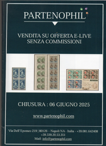 Partenophil Via Dell’Epomeo 219, 80126 Napoli, tel. 081.64.24.08, info@partenophil.com, www.partenophil.com Vendita su offerta E-LIVE senza commissioni. Chiusura 6 giugno 2025 Catalogo di 48 pagine in formato A4 tutto a colori che propone 644 lotti di francobolli, lettere e collezioni di prefilateliche, Antichi Stati Italiani, Regno d’Italia con diversa Posta Aerea e varietà, Repubblica Sociale e Repubblica Italiana, molte Occupazioni e Colonie Italiane, San Marino con foglietti e Posta Aerea, Vaticano e diverse lettere e francobolli di stati esteri. Molti poi i lotti di Posta Aerea, Zeppelin, Colonie inglesi e cartoline di “Donnine”. |