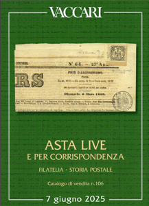 Vaccari srlvia Buonarroti 46, 41058 Vignola MO, tel. uf. 05.97.71.251, 05.97.64.106, fax 05.97.60.157, info@vaccari.it, www.vaccari.it. Asta Pubblica a Vignola sabato 7 giugno 2025 Catalogo di vendita n. 106. Il catalogo presenta in tutto 1.595 lotti, ed è, come al solito, preciso e ben illustrato e vi è pure un dettagliato indice che aiuta alla rapida ricerca dei vari settori e località. In copertina il lotto 193, base € 9.000, un giornale del 1859 con un raro segnatasse “aquilotto” di Modena. Al retro di copertina rari francobolli italiani ed esteri. L’asta inizia con lettere di tutti gli Antichi Stati italiani: Lombardo Veneto con lettere e annullamenti, molto Modena con rarità come il lotto 174, una lettera da Modena con un 25 c del 2 giugno 1852, secondo giorno d’uso. Veramente tanto Napoli e Provincie Napoletane. Interessanti offerte di Parma e numeroso Pontificio, anche qui con annullamenti, e Romagne. Poi Sardegna, Sicilia e diversa Toscana. Molti i lotti di Italia Regno, specialmente dell’Ottocento, ma con diverse proposte di tutti i tre Re, anche con lettere con particolari date, combinazioni e destinazioni. Non manca la Repubblica Sociale Italiana, Luogotenenza e Repubblica Italiana. Uffici Italiani all’Estero, Colonie e Occupazioni, Via di mare e di lago, Interi postali e cartoline. San Marino, Vaticano ed il settore Estero. Vi sono poi quasi 200 lotti di Lotti, collezioni e curiosità con album e scatoloni di francobolli, di lettere e di interi postali. Da rilevare che da Vaccari i prezzi sono comprensivi delle commissioni. |