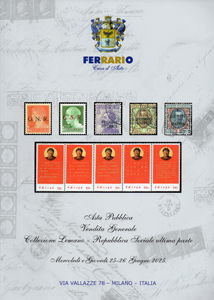 Ferrario Aste srl Via Vallazze 78, 20131 Milano, tel. 02 49 53 57 20, info@ferrarioaste.com, www.ferrarioaste.com Asta pubblica. Vendita Generale. Mercoledì 25 e giovedì 26 giugno 2025 presso la Sede di via Vallazze 78, ma anche LIVE e per corrispondenza Come ormai solito, catalogo importante, e pesante in tutti i sensi, col quale sono presentati ben 3.224 lotti proposti in tre sessioni. In copertina, al retro e nelle pagine interne di copertina una marea di francobolli della vasta Area Italiana, Occupazioni e Colonie comprese, ma anche Cina e Regno Unito. La prima sessione è dedicata agli Antichi Stati italiani e al Regno d’Italia con tante lettere, ma soprattutto francobolli. Quindi Antichi Stati italiani (tutti!), in particolare tanto Lombardo Veneto, Modena e Governo Provvisorio con affrancature e rari annullamenti, molto Napoli e Provincie Napoletane anche qui con affrancature, annullamenti e rarità; buono anche Parma. Numeroso come al solito lo Stato Pontificio con Romagne, dove spicca il lotto 357, base € 24.000, una fascetta del 1869 con un 3 cent II emissione ed un 5 cent dentellato. Poi Sardegna con annullamenti e affrancature delle varie emissioni, una ricca Sicilia e una Toscana da non trascurare. Nella seconda sessione Regno d’Italia di Vittorio Emanuele II, Umberto I e Vittorio Emanuele III, anche qui con numerose e rare proposte di francobolli, affrancature, lettere particolari e, mi ripeto, veramente tanti francobolli. Soprattutto di Posta Aerea con tanti Trittici, Zeppelin. Seguono Pacchi, Segnatasse, Buste Parlanti, Francalettere, BLP, Pubblicitari, Parastatali in grande spolvero. Poi tanta GNR, e Repubblica Sociale Italiana con la terza parte della collezione Lemano. Segue Luogotenenza e Repubblica Italiana con i primi anni (Risorgimento, Caterina, Volta, …anche in fogli o blocchi!) e Gronchi Rosa anche in quartina. È poi la volta di Trieste A e B. La terza sessione inizia con Emissioni locali, CLN, Corpo Polacco e tanto Fiume. Poi tutte le Occupazioni della Seconda Guerra Mondiale, Uffici all’estero con anche un 2 dollari Pechino caratteri maiuscoli (lotto 2093, base € 25.000), Colonie Italiane con parecchie rarità, come il lotto 2515, base € 12.000, la serie Occupazione inglese dell’AOI del 1941. Quindi molto San Marino con tanti primi numeri anche in grandi blocchi e numerosi foglietti. Vaticano con Provvisorie e Varietà. Europa, specialmente Austria, Regno Unito e Svizzera. Poi molta Cina e un po’ d’Oltremare. In chiusura 244 lotti di Lotti e collezioni dove trovare tante, tante cose degli argomenti sopra elencati. |