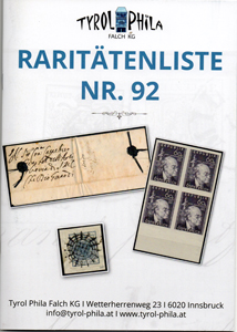 Tyrol Phila Falch kg Wetterherrenweg 23, A – 6020 Innsbruch, tel. 0043.512.361.532, fax 0043.512.365.630, www.tyrol-phila.at info@tyrol-phila.at Catalogo di Vendita a prezzo fisso n.91. Senza commissioni. A dire il vero i cataloghi sono due.