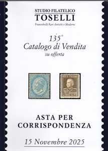 Toselli studio filatelico via Matteotti 143, 18038 San Remo IM, tel. uf. 01.84.53.15.28, fax 01.84.57.03.66, toselli@toselli.com,www.toselli.com 135° Catalogo di Vendita su offerta Asta per Corrispondenza 15 novembre 2024. Copertina con due rari francobolli italiani, al retro un famoso foglietto cinese e un trittico Volo di ritorno. Sono ben 1704 i lotti di questo catalogo che vanno dagli Antichi Stati italiani allo Spazio. Inizia con offerte di francobolli del Regno d’Italia offerti a trattativa privata. Prefilateliche, francobolli e lettere di Lombardo Veneto, Modena, diverso Napoli, Parma, molto Pontificio e Romagne, parecchia Sardegna, poi francobolli di Sicilia e di Toscana. Segue tanto Regno d’Italia del 1800 e 1900 con tante lettere con usi particolarmente interessanti, molta Posta Aerea, Segnatasse, BLP, Semistatali, Pubblicitari... Poi GNR e Repubblica Sociale Italiana, diversa Repubblica Italiana, San Marino con rari francobolli e tanti foglietti, Occupazioni, Uffici all’estero e molte Colonie. Segue Europa, Francia, Oltremare e Colonie inglesi. Quindi il vasto settore (quasi 300 lotti!) della Posta Aerea con buste e documenti anche dalle Colonie, da Vaticano, da San Marino, un po’ da tutto il mondo. |