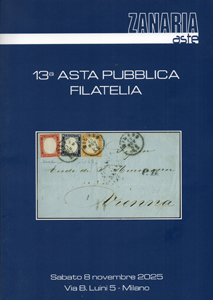 ZANARIA Aste srl via Brisa 3, 20123 Milano tel. 02.805.24.27 www.zanaria.com - email: aste@zanaria.com 13a Asta Pubblica Filatelia sabato 8 novembre 2025 a Milano Asta che si terrà anche in presenza al Chiostro di San Maurizio al Monastero Maggiore, Via Bernardino Luini 5, Milano tel 339 788 89 47 Catalogo formato A4 che presenta in tre sessione orarie: - La prima: 760 lotti di Antichi Stati italiani; - La seconda: 159 lotti di Regno d’Italia, 99 di RSI, Levante, Colonie e 14 di Repubblica, San Marino, Vaticano; - La terza: 109 lotti di Estero, Grecia in particolare, e 102 di Lotti e Collezioni. In copertina il lotto 1024, base € 40.000, una eccezionale affrancatura tricoilore di Matrire dentellati del 1862 da Milano a Vienna. Al retro il lotto 114, base € 12.000, una fascetta con un Mercurio rosa per giornali e altri rari francobolli dell’area italiana. È da porre in evidenza la qualità del materiale proposto e la scelta di documenti significativi per ogni argomento, frutto di grande esperienza nel settore. Le proposte iniziano con Lombardo Veneto, con anche una lettera col 1° giugno 1850 con un 30 c da Venezia, tanti rari annullamenti, anche un muto di Morbegno e uno di Varese, diversi francobolli per giornali, lettere della II e della III Guerra d’Indipendenza. Poi Modena, tanto Napoli con Trinacrie e Crocette, Parma, parecchio Pontificio con numerose Romagne. Notevole il Regno di Sardegna con “Cavallini”, rari francobolli nuovi delle prime emissioni e tanti usi particolari ed annullamenti. E poi Sicilia con bei francobolli e buone lettere; veramente notevole anche la Toscana e il suo Governo Provvisorio. Poi continua con Regno d’Italia con anche qui rari francobolli e lettere con insolite affrancature in particolare della DLR e Umberto, anche in fogli interi nuovi. Anche Vittorio Emanuele III con Posta Aerea, Buste Parlanti, BLP, Vi è poi la R.S.I. alla quale seguono Occupazioni, Uffici all’Estero, Levante e Colonie. Non mancano, naturalmente, un po’ di Repubblica Italiana, San Marino, Estero con molti Mercuri di Grecia. In chiusura 102 lotti di Lotti e Collezioni con tante proposte veramente interessanti e di qualità, come il lotto 4029, base € 40.000, una avanzatissima occupazione italiana di Zante od il lotto 4054, base € 5.000, una raccolta di Estonia, Lettonia, Lituania 1918/40 |