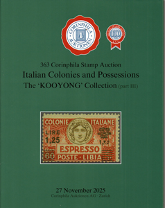 Corinphila Auktionen AGWiesenstrasse 8, CH – 8034 Zürich, www.corinphila.com, info@corinphila.ch. Aste dal n. 357 al n. 366, dal 21 al 27 novembre 2025 a Zurigo. Seconda asta nel centesimo anno di fondazione di Corinphila, un traguardo notevole come evidenziato nel catalogo di 32 pagine di Auction Information e nel numero 11 di The Corinphila Gazette, il “giornale” con The latest News di Corinphila nel quale si viene tutti invitati a partecipare alla prossima asta di Zurigo. Nei 10 cataloghi le descrizioni dei lotti sono spesso fatte anche nella lingua del paese del lotto. I prezzi base sono in CHF (franchi svizzeri). I 10 cataloghi per questa sessione autunnale 2025 di Corinphila sono arrivati in un pesante scatolone nei quali Corinphila propone migliaia di lotti di tutto il mondo di grande qualità e rarità. Inizia con il catalogo 357 Europa & Overseas dove sono proposti 2.676 lotti fra i quali quasi 100 dell’area italiana comprendendovi anche San Marino, Vaticano, Isole Jonie e destinazioni italiane. Interessante la Francia con una nutrita offerta di Ballon montés presentata col corredo di un articolo apparso su POST HORN Magazine n.13. Alla fine (lotti 2650-2676) la collezione di Peter Suhadolc Yugoslav Zone B 1945-1947. Il catalogo 358 è per i 180 lotti di una particolare collezione del francobollo australiano di 1 penny di Giorgio V. Il catalogo 359 è per i 255 lotti della collezione di Richard Debney dei Trangolari del Capo di Buona Speranza, fra i quali una lettera del 1856 reindirizzata a Roma. Il catalogo 360 è per i 612 lotti della collezione “Cowling” di lettere di tutto il mondo, da Aden a Zululand, fra le quali una decina da o per l’area italiana. Il catalogo 361 è per i 250 lotti di una collezione specializzata di posta transatlantica da o per la Francia. Il catalogo 362 è per i 111 lotti della seconda parte della collezione Sawaya di Uffici postali esteri nel Levante dove non mancano una ventina di pezzi interessanti l’area italiana. Il catalogo 363 è per 129 lotti tutti dedicati a francobolli delle Colonie e Possedimenti italiani, dove emergono i lotti 7584 e 7599 dedicati ai rari francobolli da 2 dollari di Pechino e all’espresso di Libia. Il pesante catalogo 364 è per i quasi 2.000 lotti dedicati alla Svizzera ed al Liechtenstein. Si va dalla prefilatelia ai Cantonali, dagli Strubel agli Helvetiae per arrivare fino ai tempi moderni. Il catalogo 365 è per 107 lotti tutti della seconda parte della Pablo Reim Collection di Brazil Classic Stamps 1843-1861 con eccezionali occhi di bue, inclinados, verticais, coloridos… Un catalogo particolare, il 366, è dedicato alla seconda parte della famosa collezione di Jamie Gough UPU and its Impact on Global Postal Services. Dopo i 258 lotti proposti in settembre dalla Koehler, questi sono altri 389 lotti riguardanti Gran Bretagna, Commonwealth e Oltremare dai quali pescare singolarmente, ma da esaminare globalmente per comprendere il nuovo approccio proposto da Guogh per la storia postale. Mi ripeto, ma quelli di Corinphila sono migliaia di lotti di tutto il mondo di grande qualità e rarità. |
