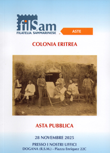 filSam Filatelia Sammarinese srl piazza Enriquez 22/c, 47891 Dogana RSM, tel. uf. 05.49.91.02.25, tel/fax 05.49.90.97.42, www.filsam.com, contact@filsam.com Asta pubblica venerdì 28 novembre 2025 a San Marino (in sala e live). Colonia Eritrea È questo il tema unico di quest’asta dedicato ad una delle più importanti collezioni del settore frutto di una ricerca ed una racconta durata più di 50 anni da parte di un grande collezionista. Riguarda tutti gli aspetti postali di questa colonia italiana a partire dalla Baia di Assab e Massaua ufficio postale egiziano e poi italiano e i vari uffici postali che hanno funzionato nel periodo. Una dedica particolare è per la Posta militare e per i prigionieri di guerra fra i quali quelli di Adua del 1896. E poi le vie di mare e le destinazioni e provenienze insolite. Anche 50 fotografie del 1800 offrono straordinaria documentazione di questo episodio storico. Un catalogo d’asta da conservare. |