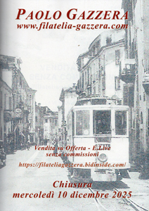 Paolo Gazzera Viale Porta Piacentina 47, 10024 Moncalieri TO, tel/fax 01.16.40.77.60, www.filatelia-gazzera.com Vendita su Offerta - E. Live senza commissioni. Mercoledì 10 dicembre 2025 https://filateliagazzera.bidinside.com/ Copertina come al solito originale con la riproduzione di un’immagine di un tram per le strade di Mondovì. Catalogo dove sono proposti 915 lotti singoli, 87 lotti di Letteratura e materiale filatelico e 74 lotti di Lotti e collezioni. Le proposte iniziano con 65 lotti di autografi, cartoline, fotografie, documenti, prefilateliche, ambulanti ferroviari, Risorgimento. Quindi francobolli e lettere di Antichi Stati italiani, specialmente Lombardo Veneto, Modena, tanto Napoli e Provincie Napoletane, Parma, Pontificio e Romagne, molta Sardegna con annullamenti, Sicilia e parecchia Toscana. Quindi tanti francobolli del Regno d’Italia, tutti e tre i re con annullamenti e affrancature di Vittorio Emanuele II e III, Repubblica Sociale Italiana, Luogotenenza, tanta Repubblica, molti Interi Postali, Trieste A e B, Terre Redente, Occupazioni, Uffici all’Estero, Egeo e molte Colonie. Poi Europa, in particolare Belgio, Francia, Germania, Gran Bretagna, Svizzera e Olanda. Alla fine, Posta Aerea. Interessanti le proposte di libri e cataloghi d’asta e in Lotti e Collezioni oltre ai temi precedenti anche collezioni di San Marino e Vaticano, molta Miscellanea , Tematica, cartoline… Da Gazzera “non vi sono commissioni o diritti o spese aggiuntive” |