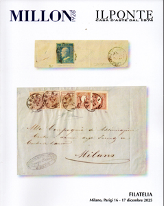 Il Ponte – Casa d’Aste srl Via Pontaccio 12, 20121 Milano, tel 02 72 02 20 83, filatelia@ponteonline.com, www.ponteonline.com In collaborazione con MILLON 1928 Auction Group di Parigi Filatelia Asta 749 per corrispondenza, telefono o online 16 e 17 dicembre 2025 a Milano e a Parigi Commissioni 26% + 3% o 5% con internet. Alberto Coda Canati in collaborazione con Daniel Berrous in questa asta presenta pezzi eccezionali come i lotti di copertina: lotto 394, stima 250/500.000 euro per uno dei due esemplari noti del ½ grana errore di colore di Sicilia e il lotto 202, base 30/50.000 euro per la grande affrancatura mista centesimi/soldi di Lombardo Veneto del 1858. In quarta di copertina il lotto 331, stima € 80/120.000 per la iconica lettera con la più alta affrancatura di Parma Sono sostanzialmente due le grandi collezione offerte i quest’asta. Il 16 dicembre la “Raccolta Annamaria” di Lombardo Veneto, dove in 276 lotti, dove sono evidenziati, a partire dalla prima emissione, le affrancature bicolori e tricolori, i colori, gli angoli di foglio, le strisce, i blocchi, le croci di sant’Andrea, le date d’uso, le affrancature miste, i falsi, l’uso delle marche da bollo, i francobolli per giornali, gli annullamenti con in particolare quelli muti. E poi tante collezioni e lotti. Mercoledì 17 dicembre è la volta della “Raccolta Mila” di Parma. In 102 lotti è dispersa una collezione eccezionale, a partire dai fogli nuovi del 5, del 10 e del 40 centesimi, affrancature bicolori e anche tricolori, i colori, gli angoli di foglio, le strisce, le raccomandate, anche le ricevute di ritorno, le destinazioni, i segnatasse per giornali, gli annullamenti. Molto interessanti anche i francobolli del Governo provvisorio e i loro usi come quello in affrancatura mista con un 20 c di Sardegna (lotto 376, stima 35/40.000 euro). Per finire anche qui con Lotti e collezioni. Vi è poi, sempre il 17dicembre, l’asta battuta a Parigi. 17 lotti veramente particolari di Lombardo Veneto, Modena, Napoli, Parma, Sardegna, Regno d’Italia, Sicilia e Bulgaria turca che meriterebbero tutti una specifica descrizione, ma che lascio a voi appassionati vedere ed ammirare. |