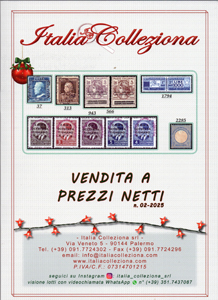 Italia Colleziona srl Via Veneto 5, 90144 Palermo, tel 091.7724302, info@italiacolleziona.com, www.italiacolleziona.com Vendita a Prezzi netti 01 - 2025 Catalogo in formato A4 di 90 pagine con in copertina e al retro rari francobolli dell’area italiana e europea. Sono ben 2.395 lotti di francobolli nuovi ed usati di Antichi Stati italiani, del Regno d’Italia, con Posta aerea e Servizi. Anche Repubblica Sociale Italiana, Occupazioni, Uffici all’estero, tante Colonie, in particolare Terre Redente, segnatasse Trentino e Bolzano, Fiume. Molta Repubblica Italiana, anche in quartine, Trieste e un buon assortimento di San Marino e Vaticano, “Area mondiale” con in particolare Austria, Francia, Svizzera, Giappone, Colonie inglesi, USA. E in chiusura 78 lotti di Lotti di collezioni e accumulazioni con centinaia d’album con francobolli di tutto il mondo a prezzi veramente invitanti. |