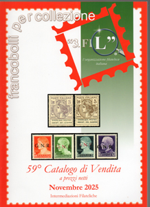 3 Fil s.r.l. “l’organizzazione filatelica italiana” Bari-Teramo Via della Pescara 16, 64100 Teramo, tel. 0861 249 324 Via Calefati 94, 70122 Bari, tel. 080 521 68 51 59° Catalogo di vendita a prezzi netti Novembre 2025 Catalogo di 112 pagine dove vengono presentati 1.201 lotti. Partendo con francobolli e lettere di Provincie Napoletane, Romagne e Parma, Sardegna e Italia Regno per passare a francobolli nuovi e usati di tutti e tre i Re con Posta Aerea, Segnatasse, Pubblicitari, BLP, Parastatali. Segue GNR e RSI e tanta Repubblica con buste viaggiate anche col Gronchi Rosa. Poi Trieste e Campione, Occupazioni e Colonie. Molta Austria, Levante austriaco, Posta da Campo austriaca per Romania, Serbia, Bosnia Erzegovina. Poi Colonie francesi e olandesi, parecchi francobolli USA. Alla fine, lotti 1199, 1200 e 1201, vengono proposte tre interessanti collezioni di lettere e buste di Vittorio Emanuele II, Umberto I e Vittorio Emanuele III a prezzi particolarmente favorevoli. |